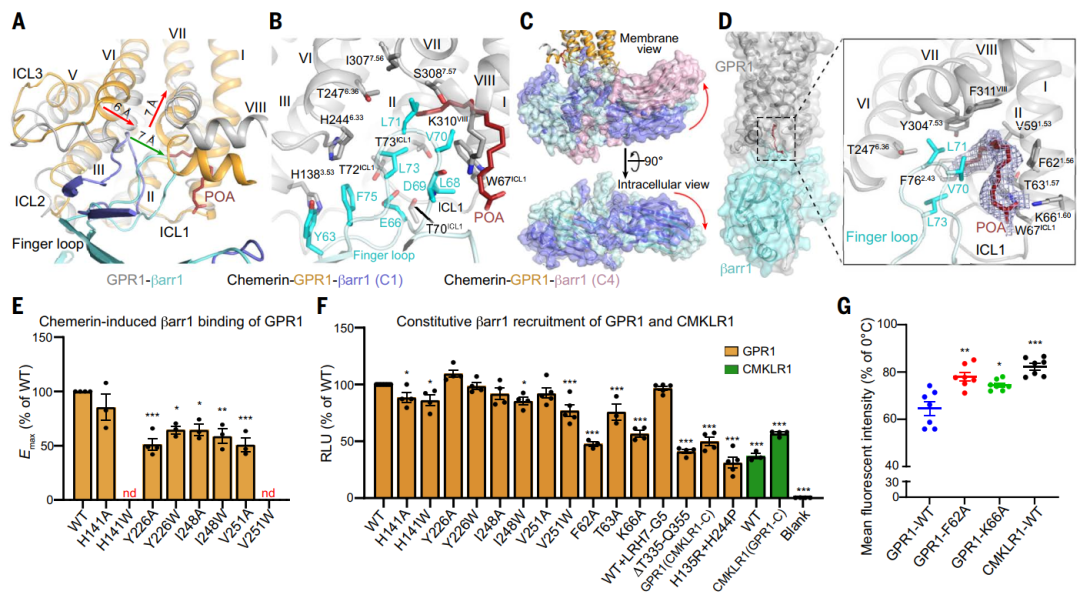 在无激动剂的GPR1–βarr1结构中,内源性脂肪酸(棕榈油酸和棕榈酸)结合在受体与arrestin的界面,增强相互作用,协助内吞,提示该类脂分子对于 GPR1 清除非激活型chemerin发挥调控作用。