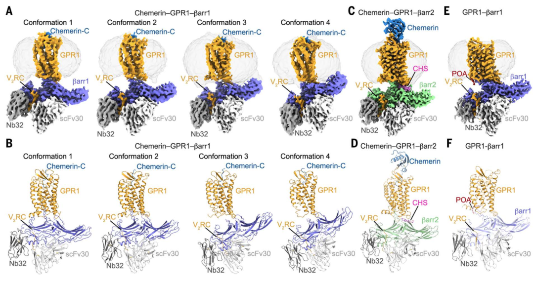 研究通过冷冻电镜首次解析了chemerin 结合态与配体游离态下,GPR1 与两种功能差异显著的 β-抑制蛋白亚型(β-arrestin 1 和 β-arrestin 2)的结合模式,从原子层面阐明了非典型GPCR的独特工作机制,为理解 “诱饵受体” 功能提供了结构依据,也为肥胖等代谢性疾病的靶向研究提供了新方向。