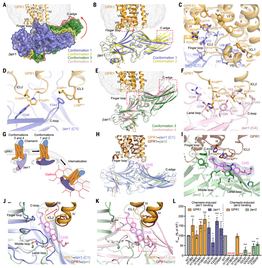 与经典A类GPCR–arrestin复合物中β-抑制蛋白单一结合构象不同,β-arrestin 1 与GPR1结合时有4种不同构象,呈现“动态摆动模型”,从水平到倾斜,可能与内化过程相关。