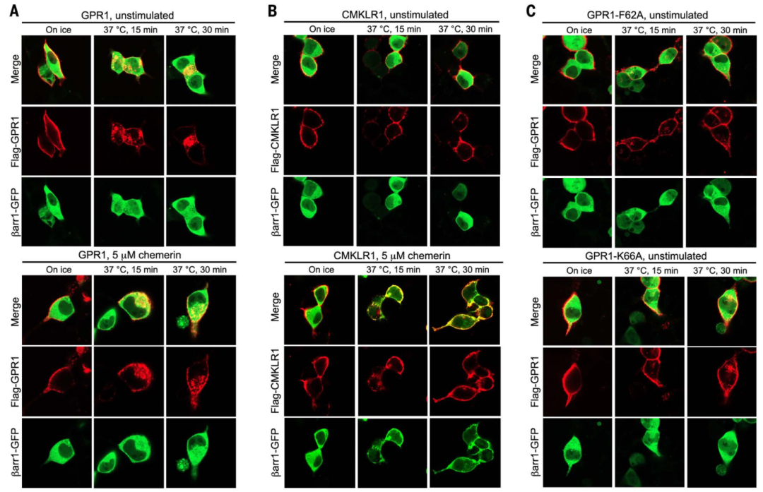 GPR1是由趋化因子样蛋白chemerin激活的受体,参与炎症、脂肪生成和代谢调控。与另一个chemerin受体CMKLR1(典型的GPCR)不同,GPR1 的 G 蛋白信号极弱,但能自发(即不依赖激动剂)招募 β-arrestin 并发生内化。因此,GPR1被认为是一个“诱饵受体”(decoy receptor),通过清除chemerin来调控其信号。
