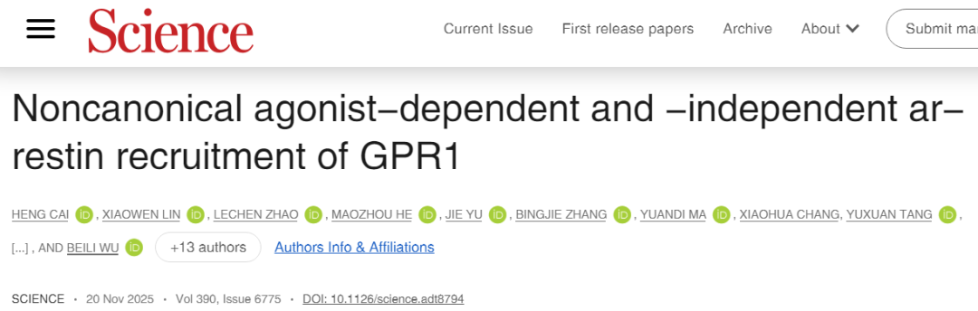 近日,上海药物所/杭高院吴蓓丽团队、临港实验室朱亚团队、上海药物所赵强、谢岑团队和上科大水雯菁团队合作在《Science》上发表了题为“Noncanonical agonist-dependent and -independent arrestin recruitment of GPR1”的研究文章。