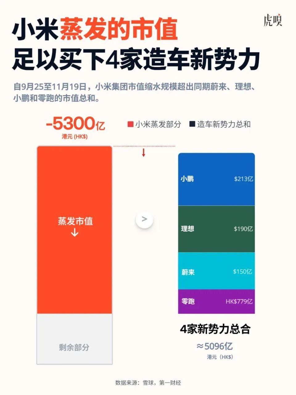 据第一财经报道,从9月25日到11月19日,小米集团市值缩水规模已经超出同期蔚来、理想、小鹏、零跑的市值总和。