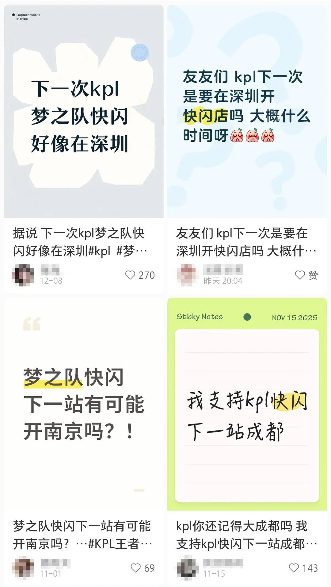所以你才能看到,上海和北京的活动一结束,小红书上就立马涌出了一大堆帖子,全是其他城市的粉丝在猜测、喊话,都希望KPL能在自己的城市办一场。