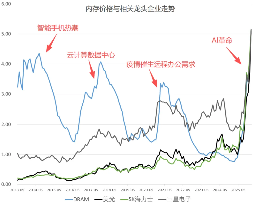 我们把过去十几年里芯片行业的三轮牛熊转换来看,发现每一轮DRAM芯片的牛市,都推动了三星、海力士、美光的大涨。