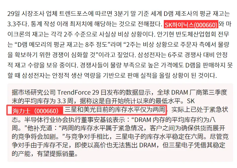 根据《首尔经济》在2025年9月的报道,全球库存现在只有3.3周,而三星、海力士、美光则平均只有2周了,属于极度紧张的状态。