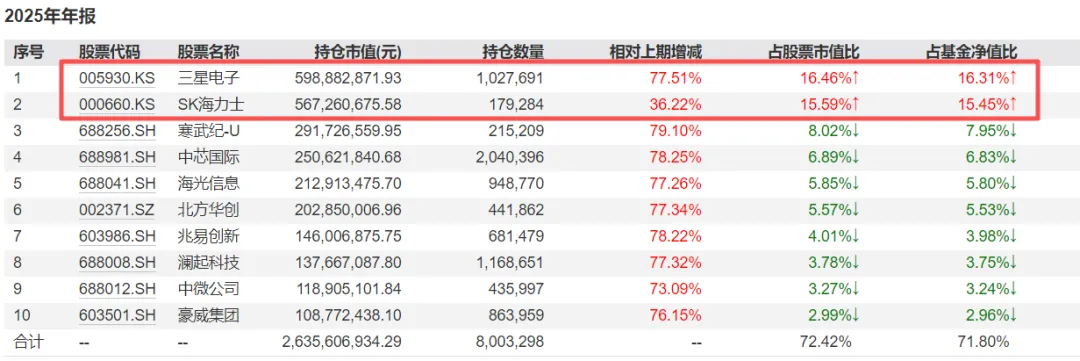 核心就是因为里面三星持仓占比16.31%,海力士占比15.45%,两者加起来的权重接近整个基金的三分之一。