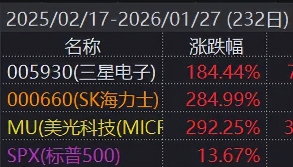 由于AI厂家需求和下游囤货,供给缩减等综合原因,导致了存储芯片的史诗级上涨,这一轮部分存储芯片累计涨幅已经超过500%,三大厂商的股价也同步迎来一波暴力拉升,目前远远跑赢标普指数中。