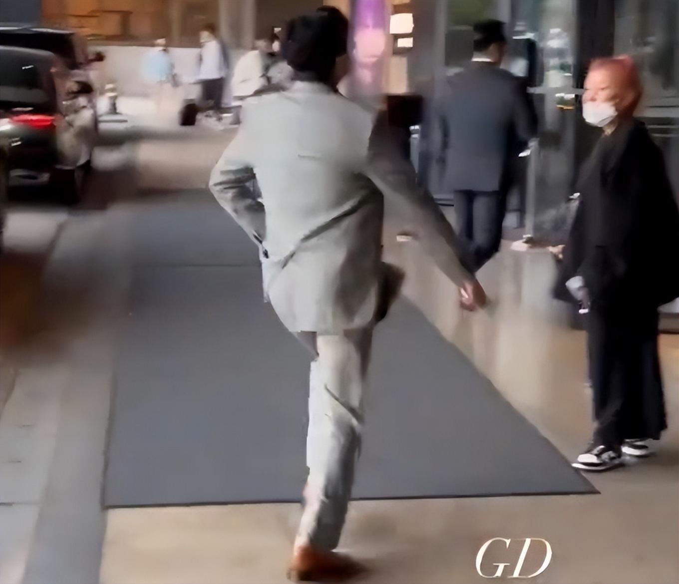 权志龙粉色衬衫搭配浅灰色西装套装,儒雅中又带有一丝俏皮。