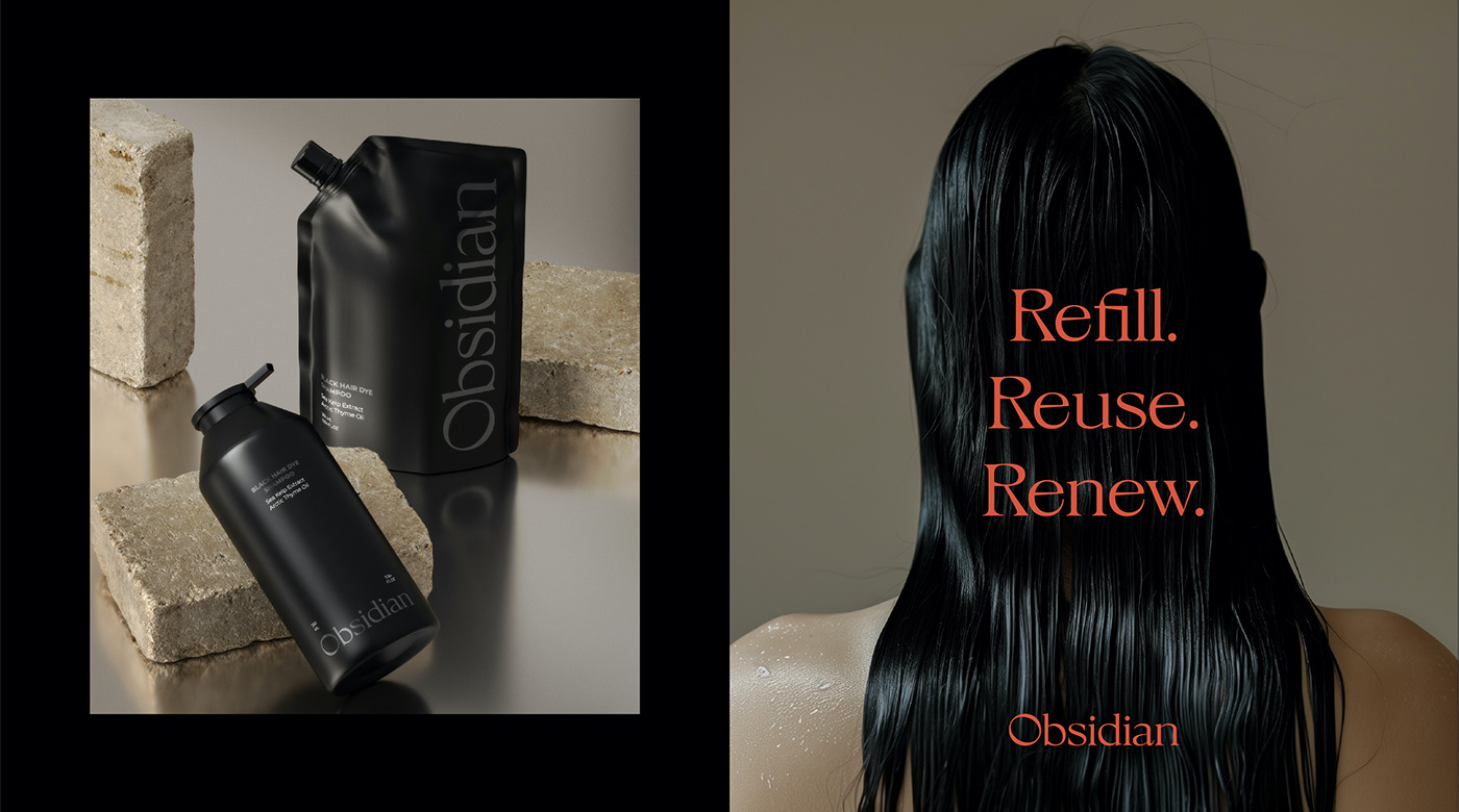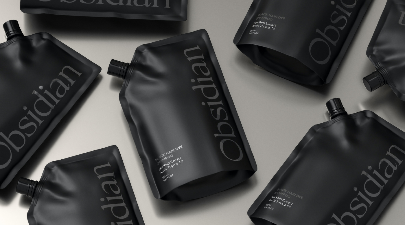 Obsidian 的包装设计,宏洛图认为是对黑色系质感表达的精彩演绎,整体宛如黑曜石般沉稳大气。同样以黑色为主色调,却在设计师的巧思下通过不同的包装形态展现出别样魅力,让单一色调拥有丰富的视觉层次。瓶装设计硬朗挺括,线条简洁有力,搭配简洁的白色品牌名称,形成强烈的视觉对比,极具现代感,契合“第一眼视觉吸引力” 的设计核心。包装上的文字信息排版规整,清晰易读,传递出专业、可靠的品牌形象,让包装的视觉表达与品牌调性高度契合。而袋装系列则采用了独特的软质包装,在保持黑色基调的同时,增加了包装的柔和感与灵活性,满足不同使用场景的需求,兼顾设计美感与场景适配性。整体设计无论是从色彩搭配还是形态选择上,都彰显出品牌对品质与美感的执着追求,也体现了宏洛图在包装设计中对材质、形态与品牌叙事的精准把握。