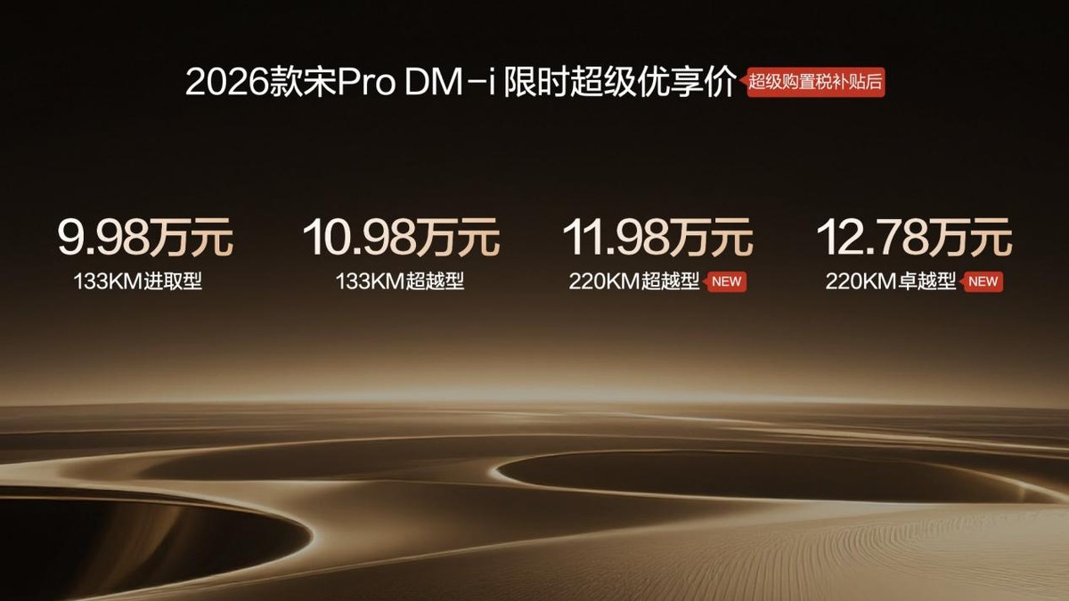 继比亚迪秦家族在续航、配置等方面再进化,竞争力持续提升,比亚迪正式宣布2026款宋Pro DM-i上新220km长续航版本,全系限时超级优享价9.98-12.78万元。