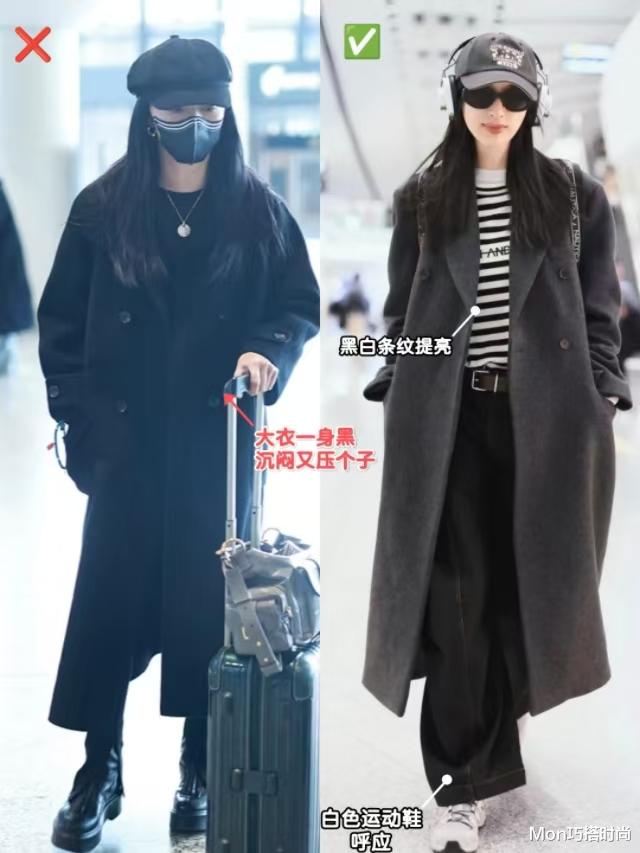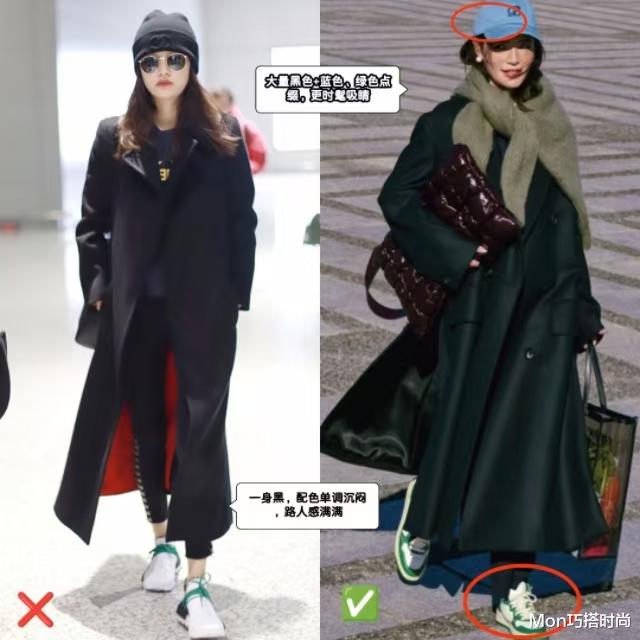 再者就是大衣+运动鞋的配色太沉闷单调,譬如左边的一身黑大衣+小白鞋,配色普通,哪怕颜值再出众也显得路人感满满。