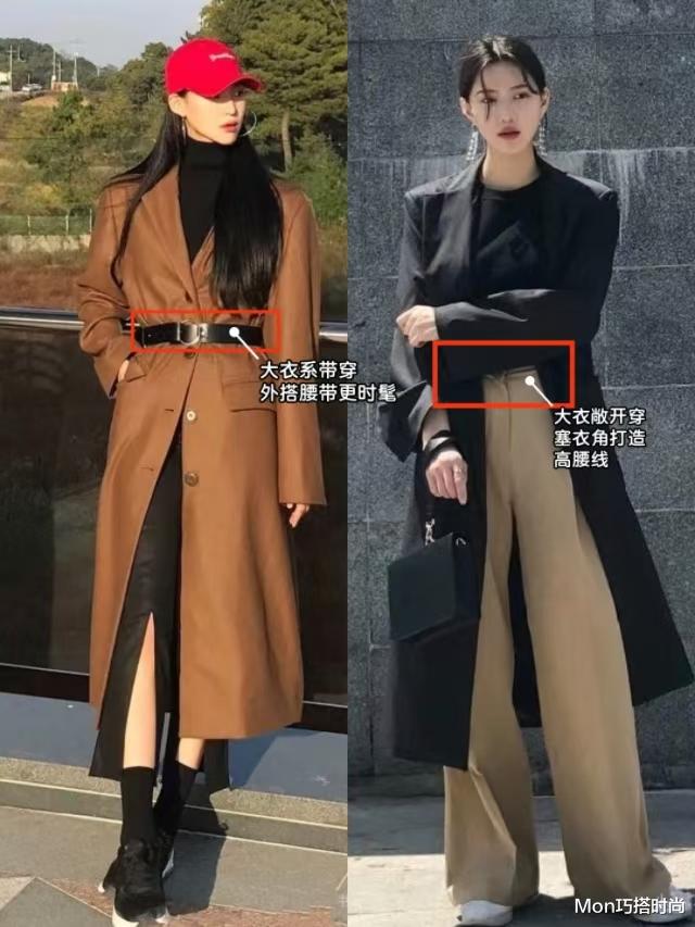 敞开穿大衣,打造高腰线的方式就更多了。内搭上短下长、上下撞色都是基本操作,还可以上紧下宽+塞衣角同时穿,普通人也能拥有超模同款九头身比例~