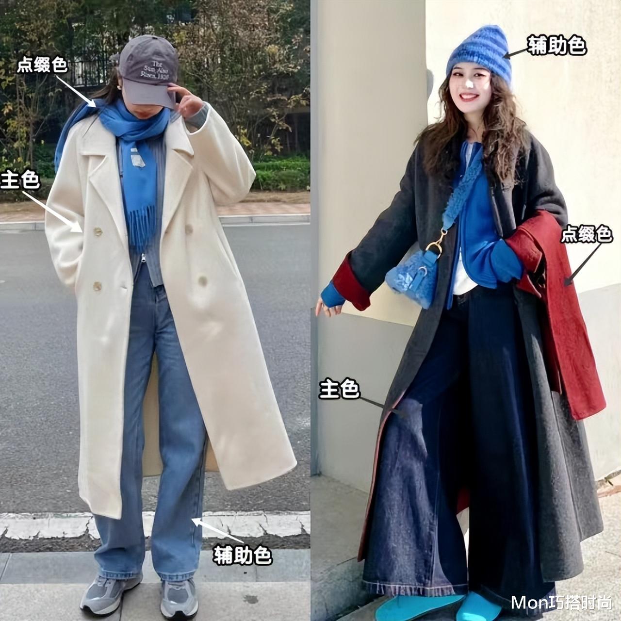 通常占据主体位置的大衣和长款下装选择基础色更保险。选彩色时最好和其他单品冷暖色调统一,或保持相似的明度或饱和度。