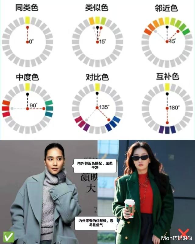 一些理论派的时髦精也会看“色相”来配色。色相环上相距30°的同类色和相距60°的邻近色会让搭配更和谐干净。