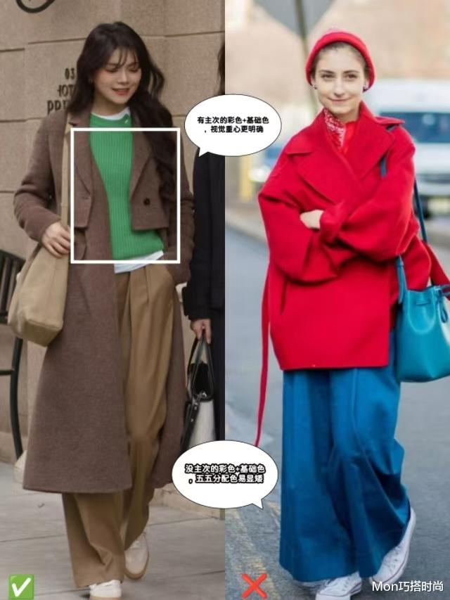 咱们的搭配可不只有基础色,彩色也得用起来。怕出错那就用“基础色+彩色”,但得有明确的主次之分,五五分配色不仅死板还会压个子哦~