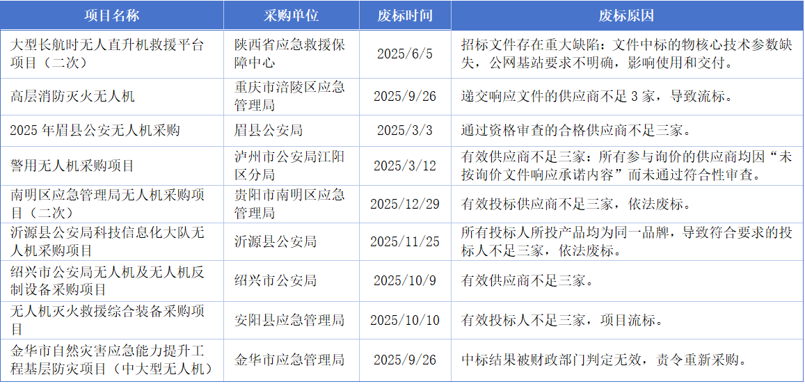 通过检索中国政府采购网、全国公共资源交易平台等权威渠道,不完全统计全国范围内应急领域无人机采购废标(含终止采购)典型案例超10起,覆盖中央、省、市、区四级采购主体,涉及地震应急、森林草原防灭火、交通应急、基层防灾等多个应用场景。