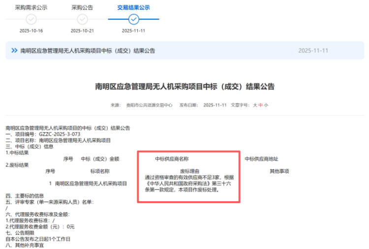 2025年11月11日,全国公共资源交易平台发布公告,贵州省贵阳市南明区应急管理局无人机采购项目(项目编号:GZZC-2025-3-073)中标(成交)结果作废,废标理由为“通过资格审查的有效供应商不足3家”,依据《中华人民共和国政府采购法》第三十六条第一款规定终止采购流程。