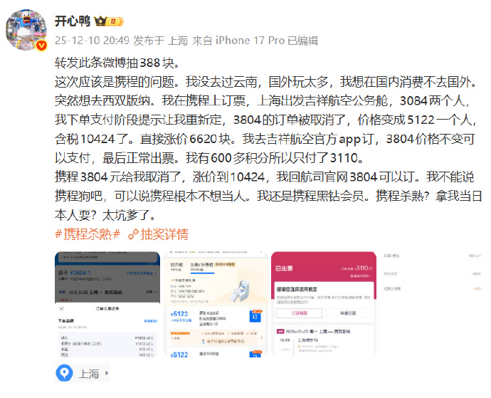 据新浪财经报道,12月10日,博主“开心鸭”发博称,自己在携程APP下单上海-西双版纳公务舱机票,支付时订单被无故取消,价格从3804元跳涨至10424元。作为黑钻会员,他随后在吉祥航空官方APP以原价3804元成功购票。事件直指平台可能存在“大数据杀熟”或技术故障,侵害消费者权益。