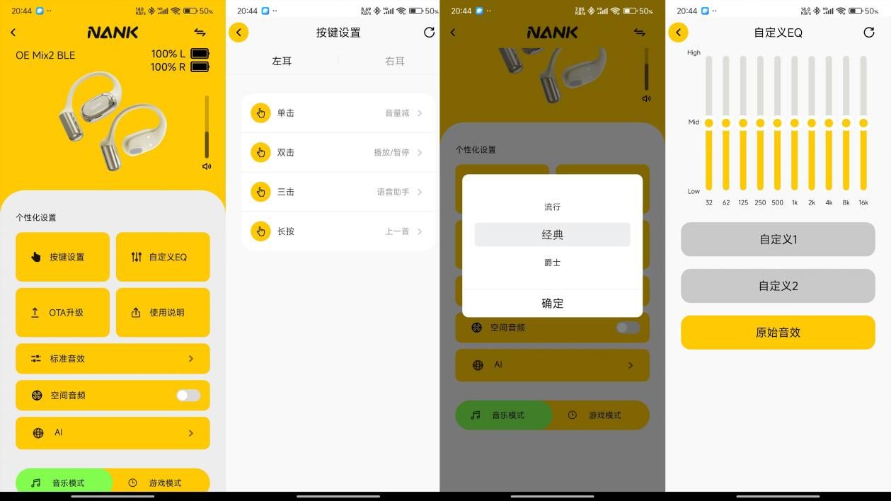 OE MIX2还能通过APP进行智能操控。通过APP可以修改快捷键设置,让耳机的操控更符合每个人自己的使用习惯。同时,还可以通过标准音效和自定义EQ,调整音乐风格,或者直接设置自己的专属音质习惯。