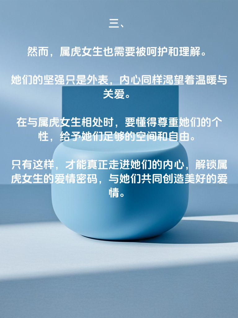 一、属虎的女生,犹如山间的猛虎,充满着力量与勇气。她们外表坚强,内心却藏着柔情似水的一面。在爱情中,她们会像护卫一样,全身心地守护着自己所爱的人,不让对方受到任何伤害。 二、属虎女生的爱情密码,在于她们的真诚与直接。她们不会隐藏自己的情感,喜欢就是喜欢,讨厌就是讨厌。当她们爱上一个人时,会毫不保留地付出自己的一切,用自己的方式去关爱对方。 三、然而,属虎女生也需要被呵护和理解。她们的坚强只是外表,内心同样渴望着温暖与关爱。在与属虎女生相处时,要懂得尊重她们的个性,给予她们足够的空间和自由。只有这样,才能真正走进她们的内心,解锁属虎女生的爱情密码,与她们共同创造美好的爱情。