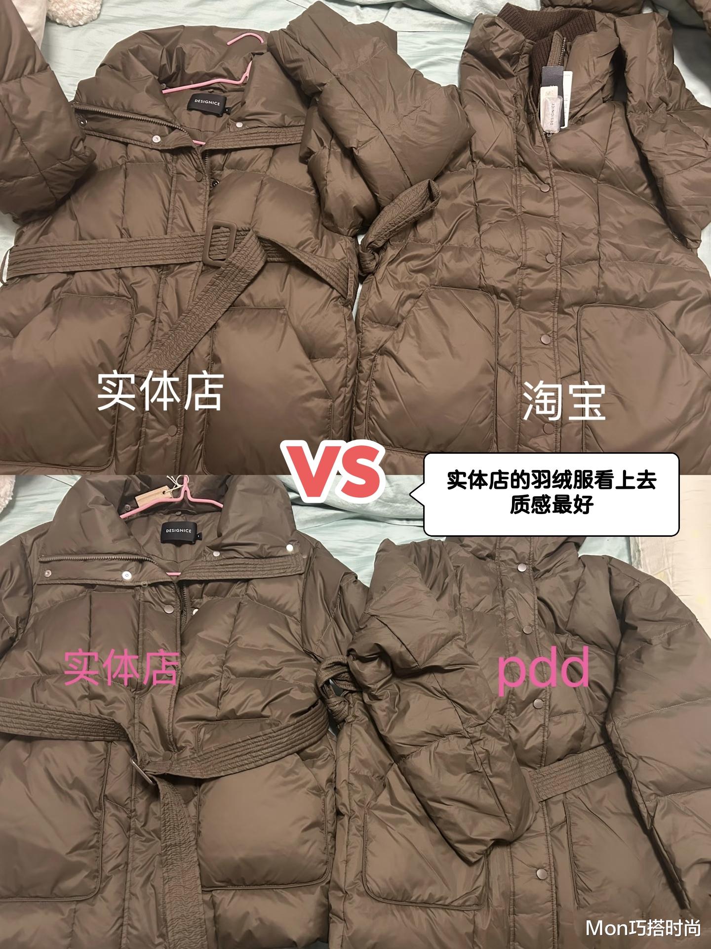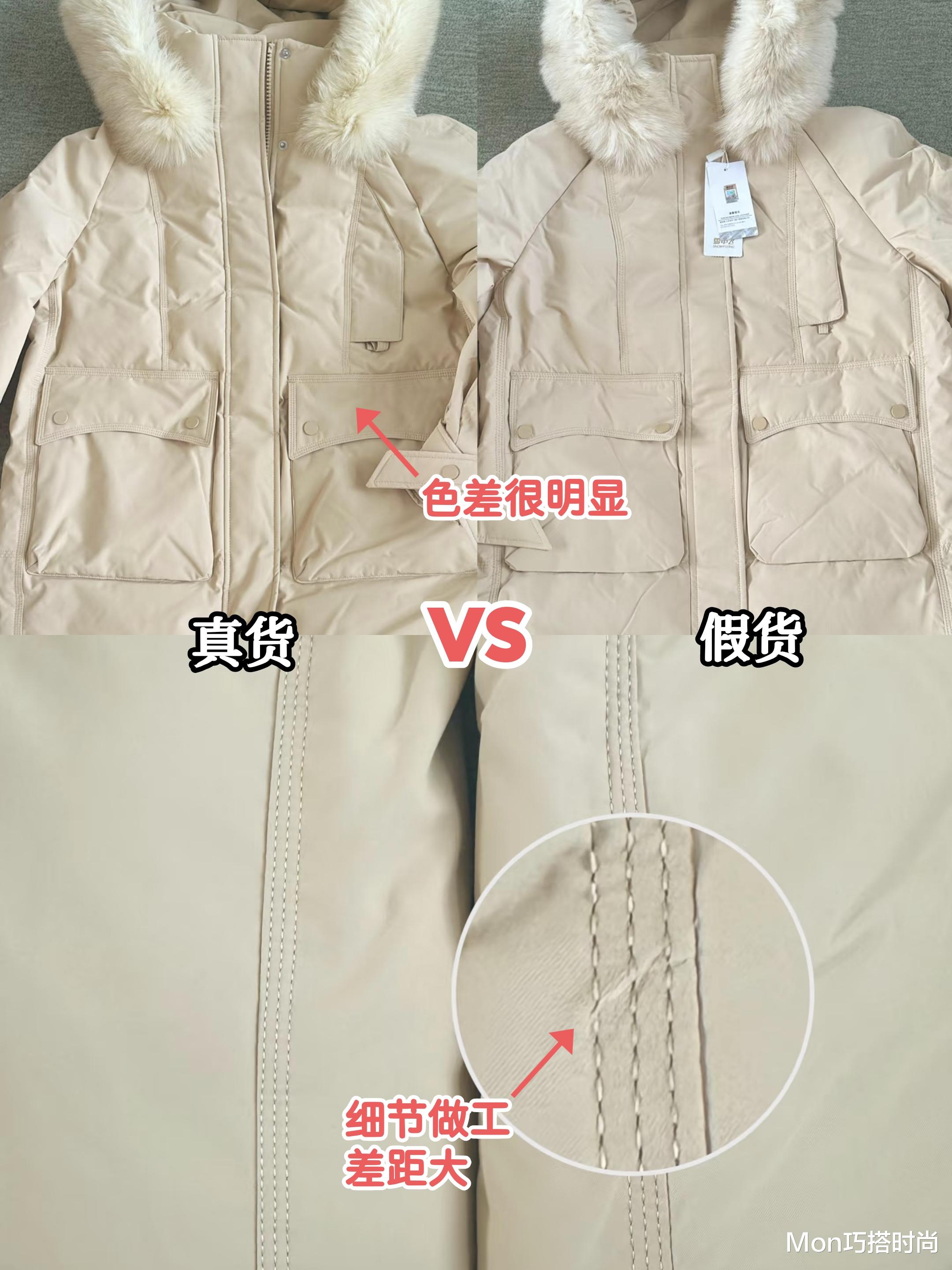 不过我们可以从款式细节上进行辨别,你瞧,原版的雪中飞羽绒服是香槟色,而右边的假货明显更偏粉色,袖口也很干瘪,针脚真是稀疏粗糙,所以大家买平价羽绒服还是最好去线下实体店买。