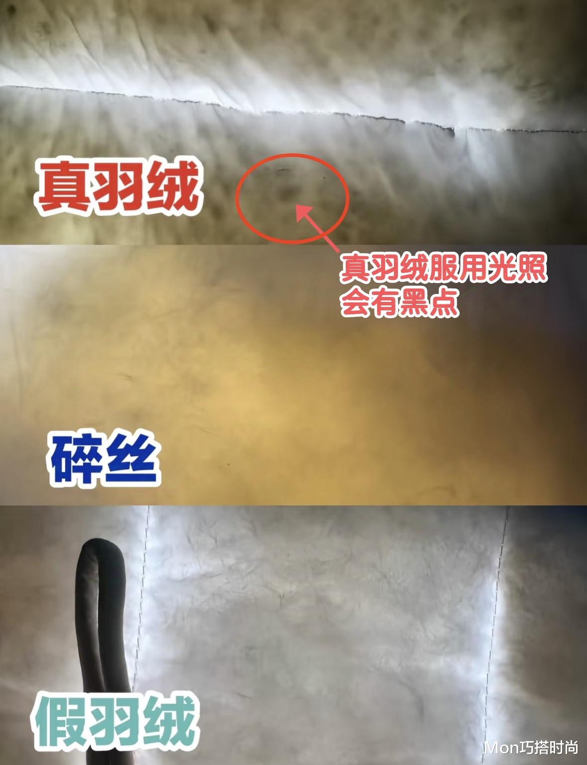 如果你是去实体店买的羽绒服。也可以将羽绒服拿到光下看影子,羽绒都是一朵一朵的,在光下会透出黑点状的影子,如果影子呈丝状或者絮状,那就是假羽绒。