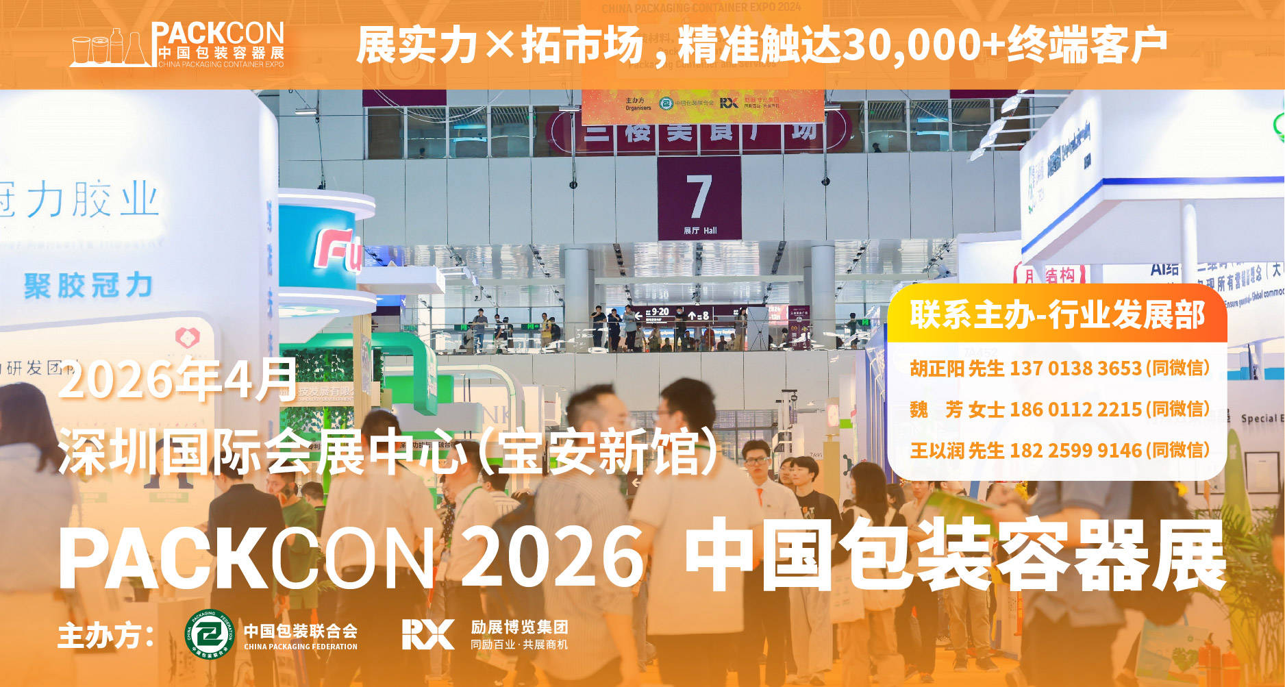 此外,PACKCON还将特邀行业领袖、技术专家及品牌决策者齐聚现场,聚焦轻量化技术革新、用户体验优化及包装设计等核心议题,分享前沿政策动态、创新技术成果与市场趋势洞见,赋能包装企业抢占发展先机。展商报名现已开启!即刻扫描下方二维码报名,解锁行业精彩内容与无限商机!2026年4月,深圳国际会展中心(宝安),我们与您不见不散!