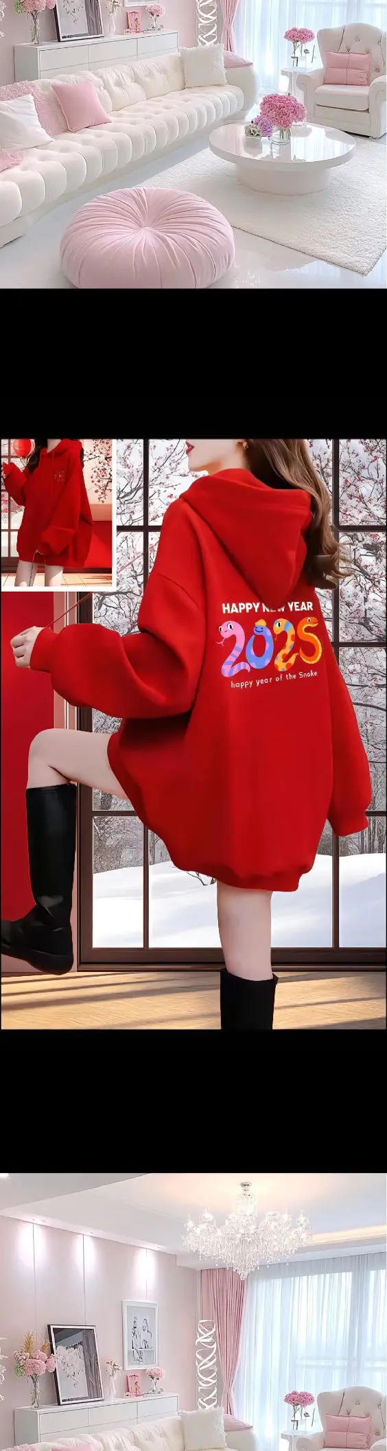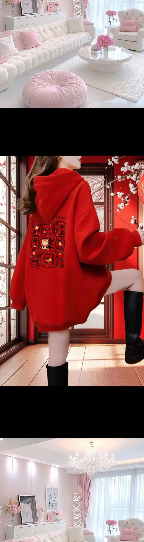 姐妹们~新年战衣!红色连帽卫衣,姐妹们!这件秋冬红色连帽卫衣2025新款蛇年本命年专属红色连帽卫衣,加绒加厚设计,保暖又时髦,简直是寒风中的一股暖流!亮眼正红色,加绒内里贴身穿也很舒服~洋气又保暖,连帽设计,休闲随性,简约而不简单,时尚百搭!本命年礼物自用两相宜。穿上它,不仅暖和了身体,更温暖了心窝。时尚百搭宽松版型