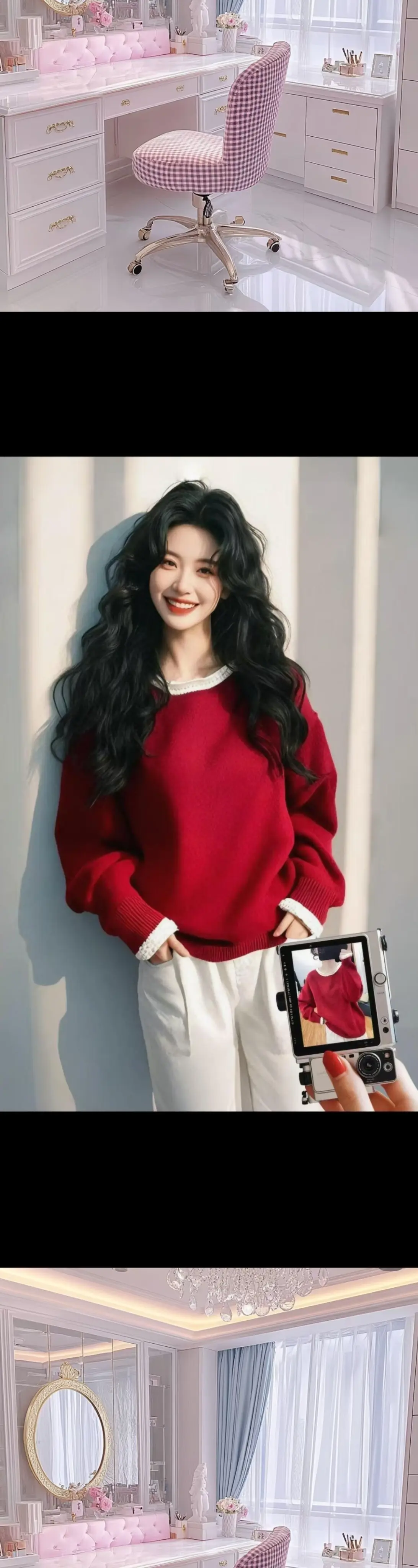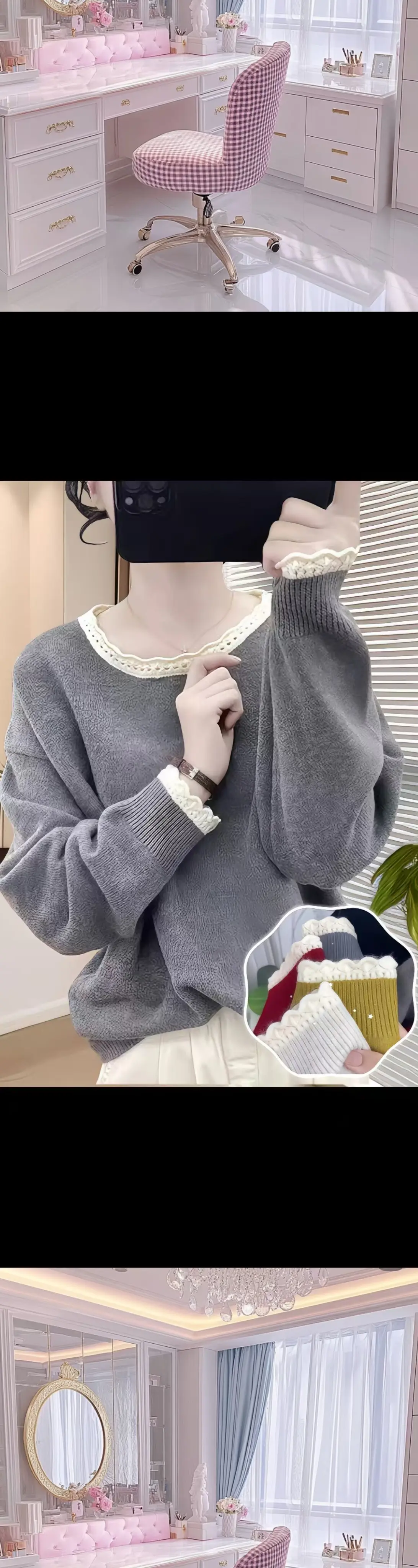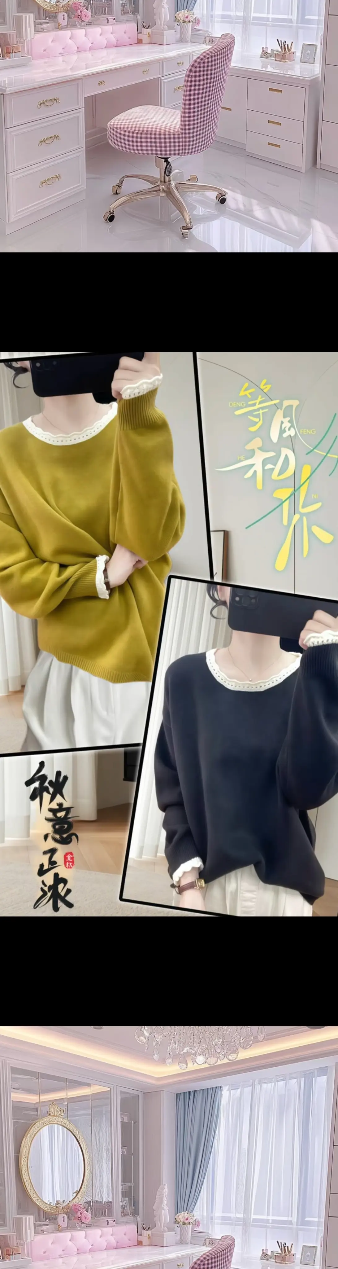 🍂减龄花边针织衫。🌈 款秋冬花边领拼色针织衫真是太美了!2024 新款,设计感满满呀!宽松的版型,舒适又减 龄,完美遮掩小肚子,搭配长袖让你在这寒冷的季节依然温暖可人。圆领打底衫的设计,让整体显得优雅又时尚