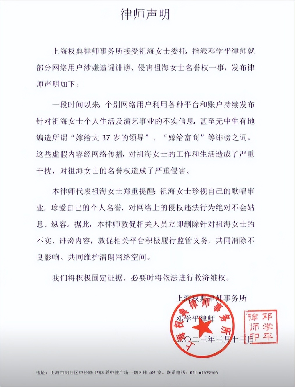 2023年,祖海的律师团队不得不再次发布声明,严正否认所谓的婚姻传闻。