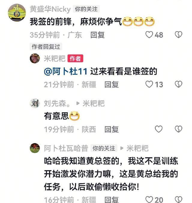 米尔扎提晒训练照,期待新开始。陕西联合董事长黄盛华亲自留言:“我签的前锋,你得争气!”米尔扎提立马回应阿卜杜瓦哈普:“你来看看,谁签的?”阿卜杜瓦哈普笑答:“当然知道是黄总签的,我那是在逗你,想激发你潜力呢!”