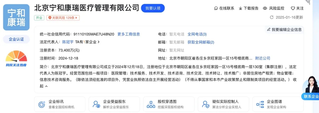 2024年12月,北京宁和康瑞医疗管理有限公司的新企业成立,该公司由抖音集团(香港)有限公司全资子公司——北京字跳网络技术有限公司全资持股。