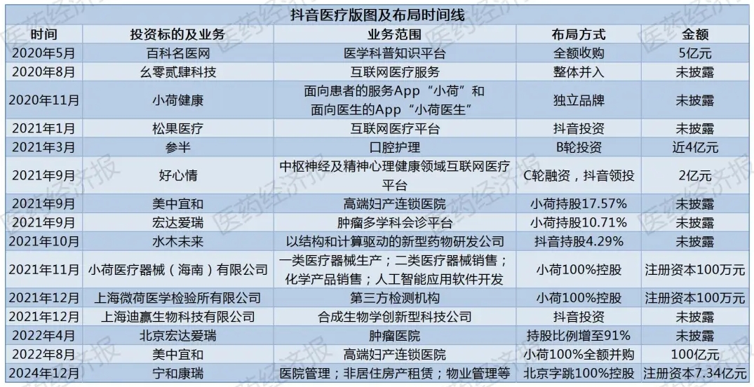 字节跳动在医疗领域的投资与并购策略显然是其扩展版图的主要手段。