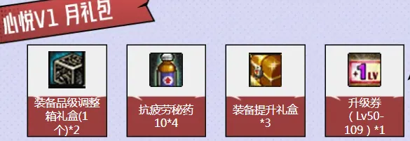心悦1:2个品级调整箱,4瓶疲劳药剂(10点)、3个装备提升礼盒,1个升级券;