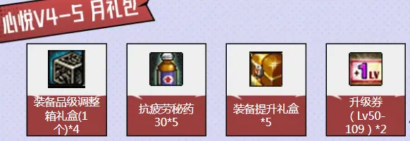 心悦4-5:4个品级调整箱、5瓶疲劳药(30点)、5个装备提升礼盒,2个升级券。