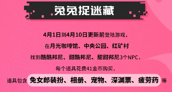 进入4月份后,全民白送兔女郎装扮,找到对应的NPC兑换即可。