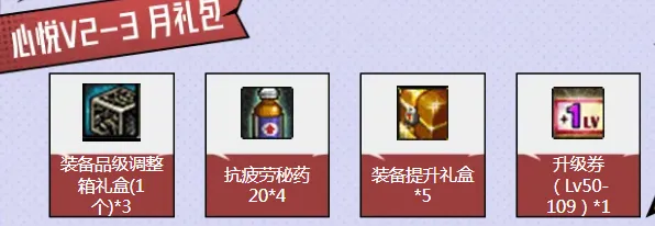 心悦2-3:3个品级调整箱、4瓶疲劳药(20点)、5个装备提升礼盒,1个升级券;