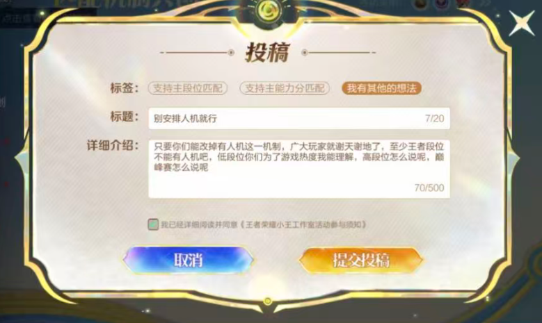 王者荣耀这么多年来,被玩家陆续发现一些问题所在,比如说皮肤锚点,还有匹配机制等等,甚至在今年还有入机和野区经济,都是让玩家有点懵圈。而这次,王者荣耀提出的匹配机制共创重做当中,不少玩家也都提出了自己的意见。这些玩家的意见出奇一致,相信玩家们都看到了吧?没错,这些玩家希望王者荣耀“别再安排入机”就行。毕竟,王者荣耀是5V5公平竞技手游,低段位加入机时情有可原,但是希望中高段位的话,能够保持正常对局就行了。当然了,入机是玩家比较希望王者荣耀能够移除的,毕竟这样玩家们才能有更好的游戏体验,天美该好好反省了。