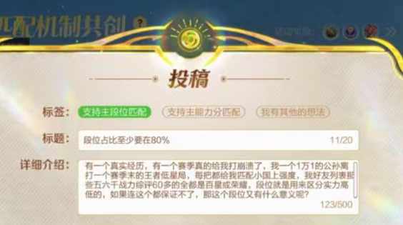 当然了,也有的玩家将自己在王者荣耀的真实经历,提交给了策划。比如说自己1.1w战力的公孙离,结果在赛季末匹配到小国标对手。其实说白了,就是战力和段位不匹配,甚至有的玩家基本上靠堆场次就能够上荣耀百星,甚至更多,这无疑是不行的。在我看来,王者荣耀玩家对匹配机制的重做,还是很有发言权的,毕竟玩游戏的是我们玩家啊。但是,最终王者荣耀官方会怎么重做,只能看后续的发展了。那么问题来了,你们认为王者荣耀这次会不会真的推出新版匹配机制呢,记得在留言区跟我交流沟通哈。