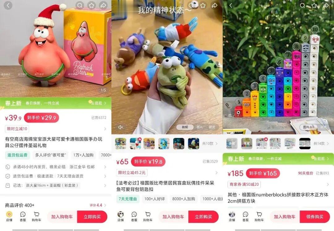 从销量来看,这类商品的市场需求不容小觑。截至3月14日,某商家所售“派大星手办”,售价39.9元,已售6372件;另一商家所售“祖国版比奇堡居民呆呆鱼”,到手价19.8元,已售3529件;还有商家所售“祖国版numberblocks积木”,售价66.4元,已售893件。