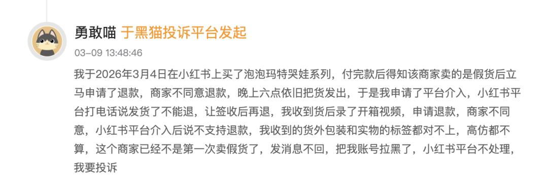 另一位消费者的经历则更扎心。3月4日,他在小红书买了泡泡玛特哭娃系列,付完款后得知该商家卖的是假货,立马申请退款,商家不同意退款,晚上六点依旧把货发出。于是申请平台介入,小红书平台打电话说发货了不能退,让签收后再退——结果是,消费者收到货后录了开箱视频,申请退款,商家不同意,小红书平台介入后说不支持退款,偏袒商家。“收到货外包装和实物标签都对不上,高仿都不算。”