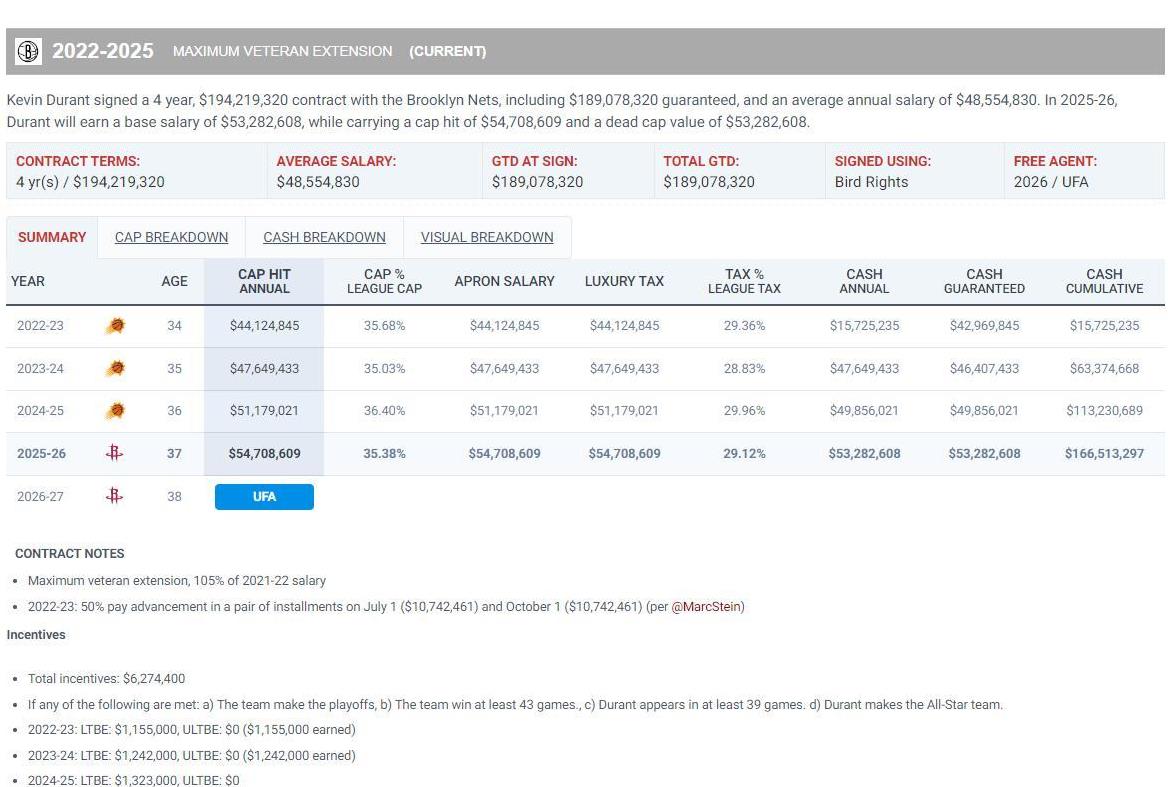 火箭队为何未签杜兰特?根据之前薪资结构专家鲍比·马克斯的分析,杜兰特今年夏天其实是有机会和火箭队签一份两年、总价值1.22亿美元的顶薪合同的(不过因为38岁条款限制,只能签两年)。如果他等到2026年1月工资帽再次上涨之后,还能再签一份两年1.24亿美元的顶薪。这两份合同的平均年薪都超过6000万美元。可是问题来了,为什么火箭队到现在还没动手呢?这事儿看起来有点奇怪,毕竟这么大的合同摆在那儿,按理说他们应该早有动作才对。