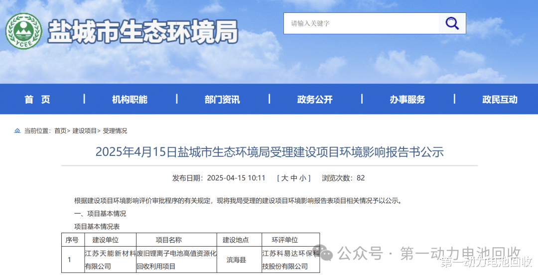 第一动力电池回收消息,近日,江苏省盐城市生态环境局正式发布“江苏天能新材料有限公司废旧锂离子电池高值资源化回收利用项目”环境影响报告书受理公示,标志着这一具有里程碑意义的绿色项目正式步入公众视野,预示着我国动力电池回收行业将迎来新的发展篇章。