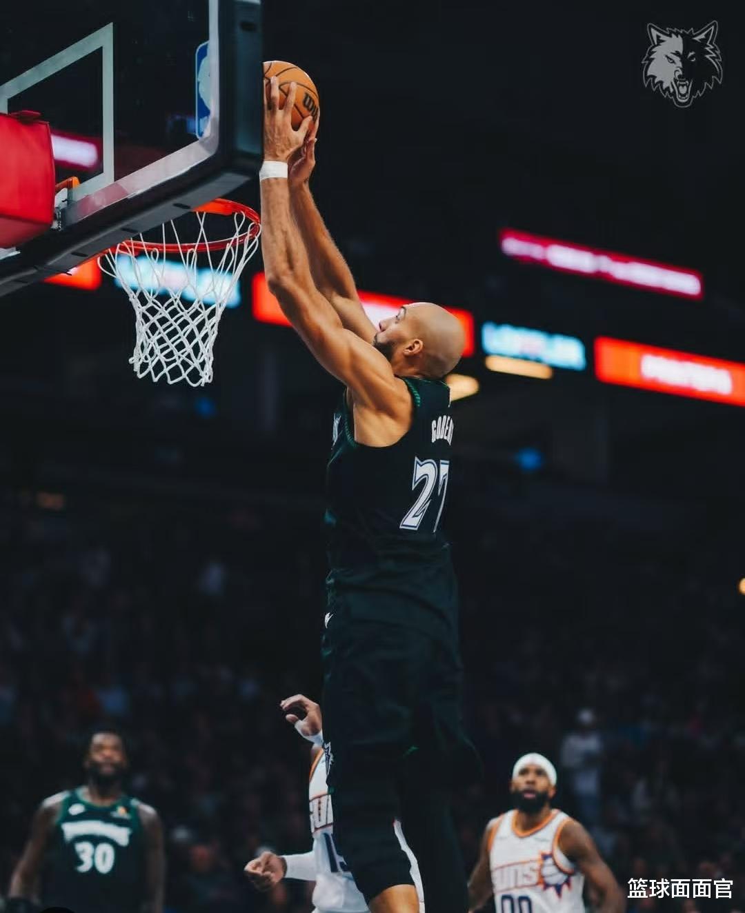 这种情况下,鲁迪完成了他半场多一点的比赛。失去了内线防守铁闸的森林狼,内线被太阳队队的不断的冲击。数据显示,当他在场时,防守效率值107.9,净效率值+8.7。当他下场时,防守效率值119.7,净效率值-3.2,相差近10分。