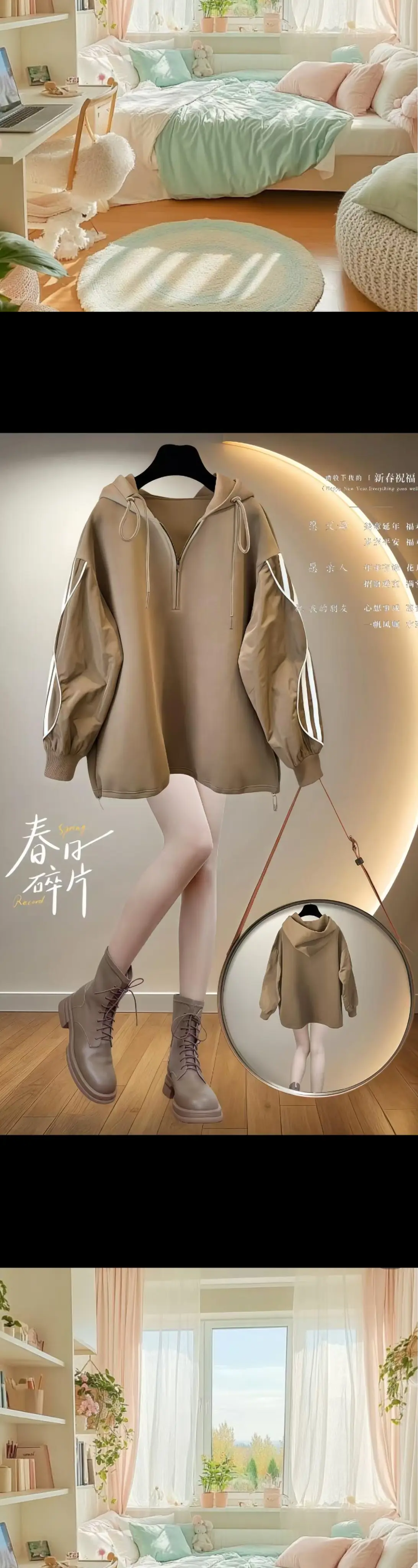 平平无奇的连帽卫衣上身显瘦又百搭。春秋之交,韩系卫衣盛行,尤为引人注目的便是那款条纹拼接的半拉链连帽款式。其以少年感十足的韩版设计亮相,诠释了帅气与休闲的双重韵味。宽松的版型给予了穿着者的,百搭且不拘束。