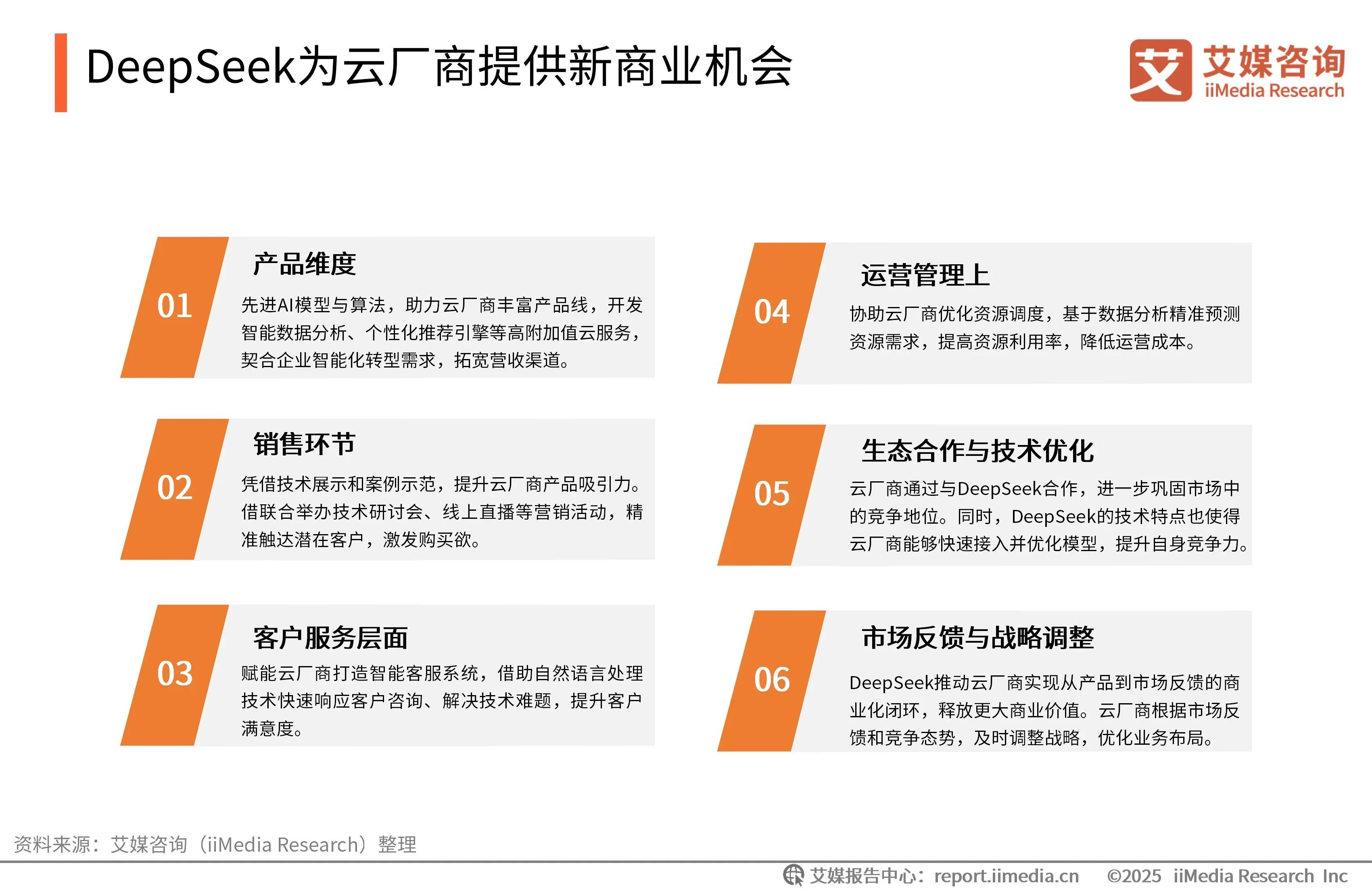 DeepSeek全链条赋能云厂商,不仅能让云厂商提升现有服务效能,更能基于AI技术衍生出智能决策、生态协同等新型商业模式,开辟增量市场空间。随着技术迭代与生态扩展,DeepSeek将持续推动云计算产业向智能化、普惠化方向演进。