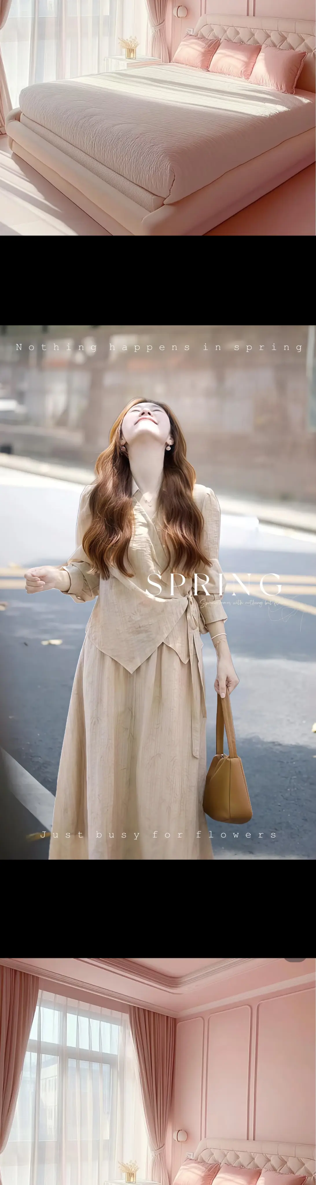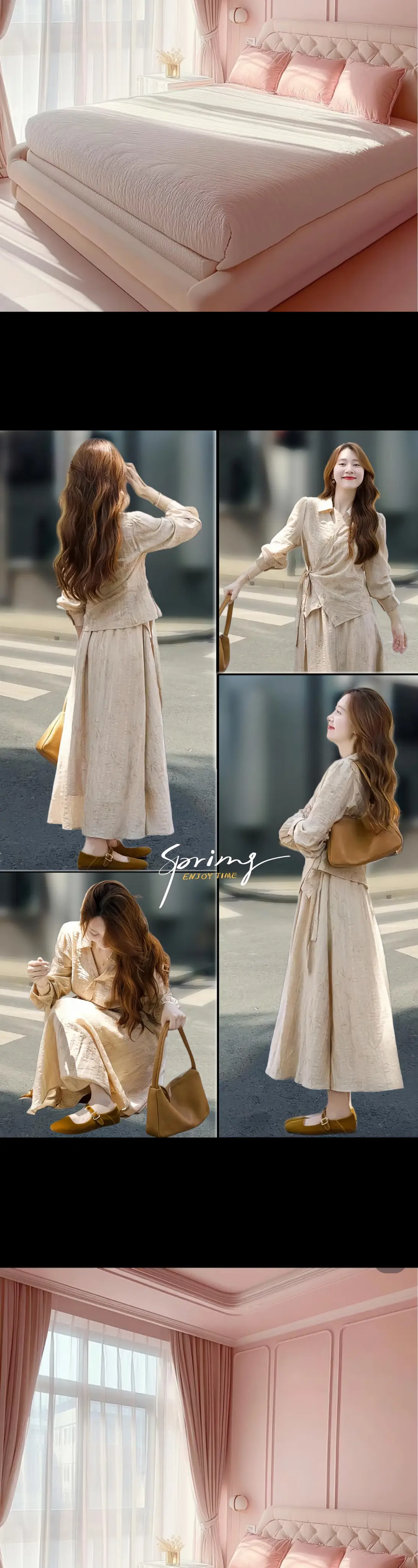 新中式国风绑带衬衫+同色系垂感半身裙,温婉气质,春天这样穿真的太美啦!面料很有质感,没有过多的元素,温柔简洁大方。版型不挑身材和年龄。