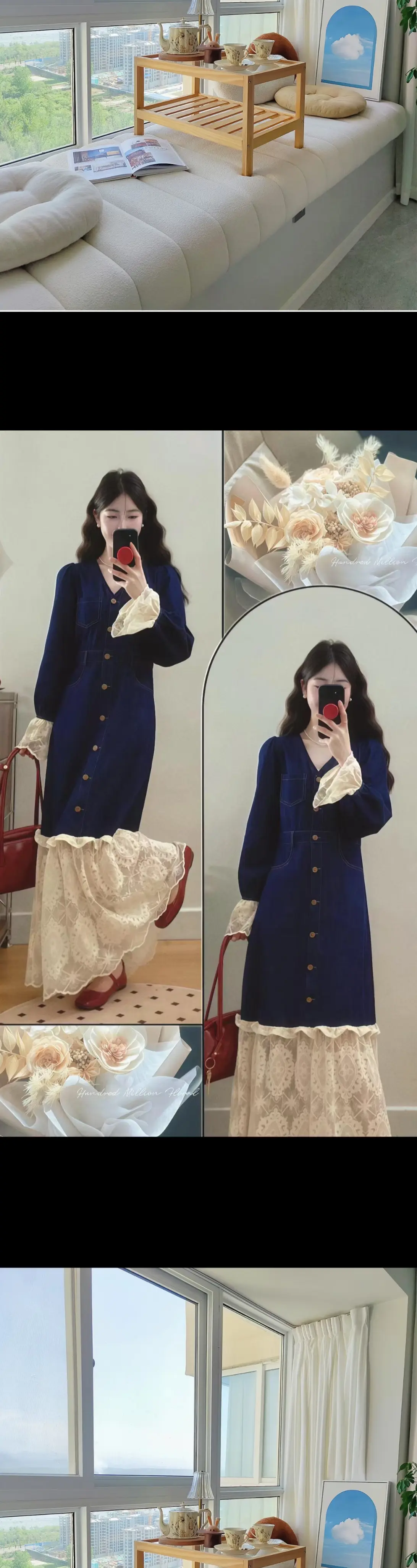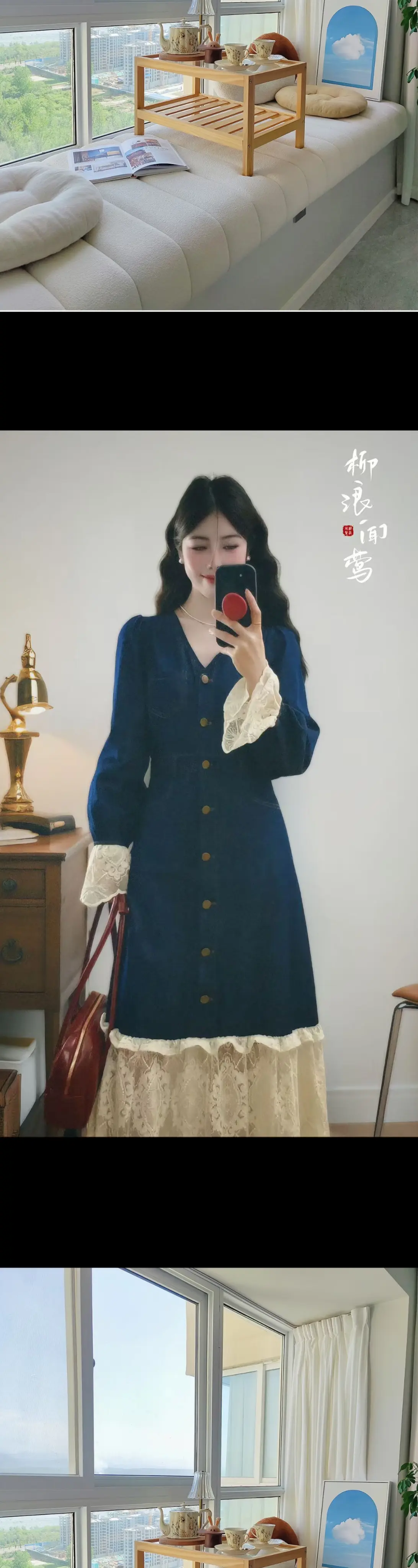 这条大码春季新款连衣裙简直是法式复古风的神!牛仔面料超有质感,收腰设计狠狠拿捏了身材曲线,蕾丝拼接温柔又精致,泡泡袖更是甜美加分。长袖的设计,早晚温差大也不怕。