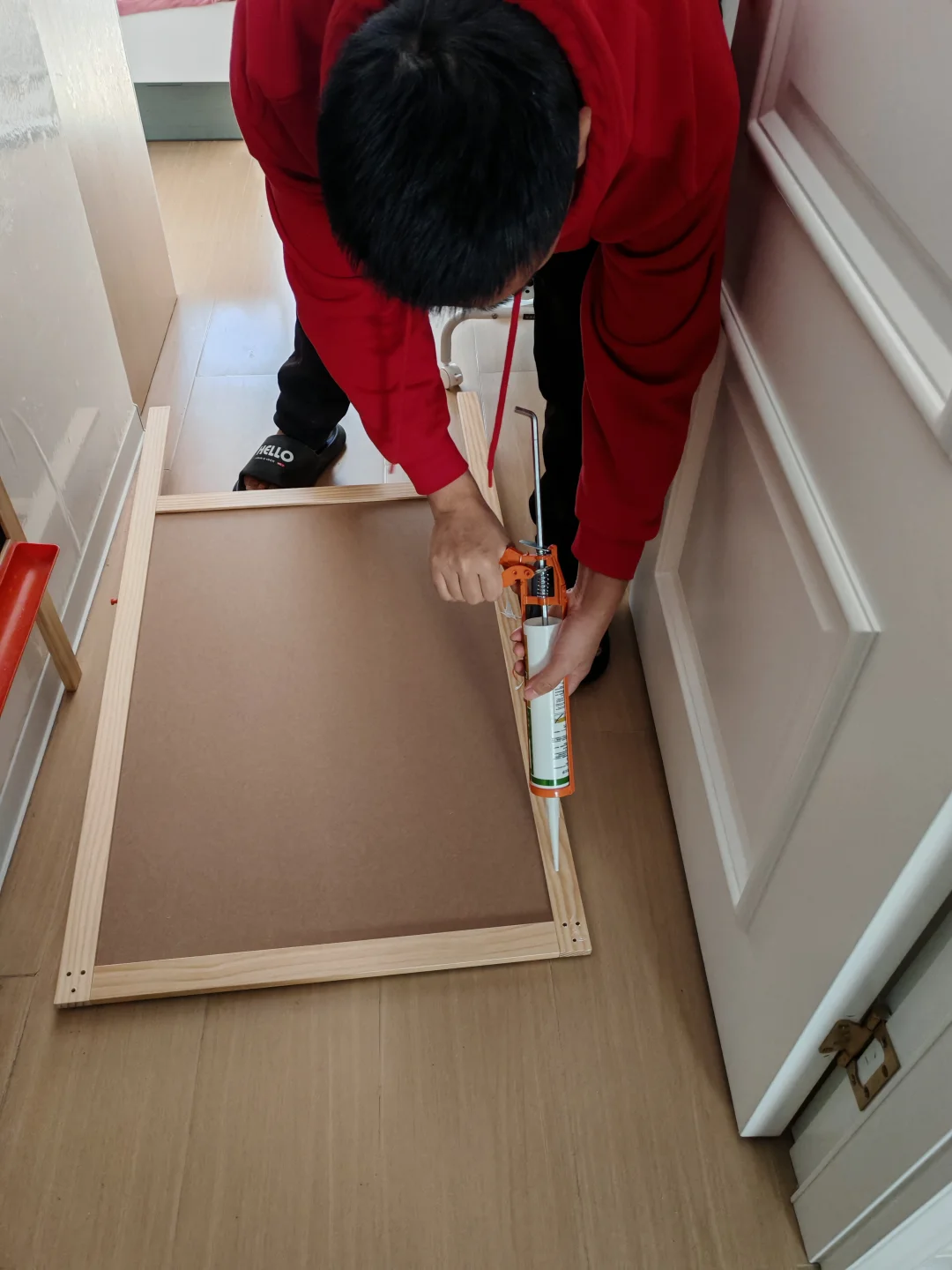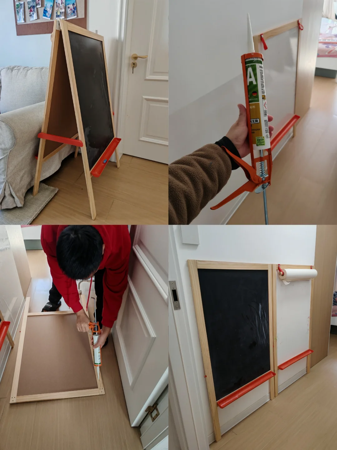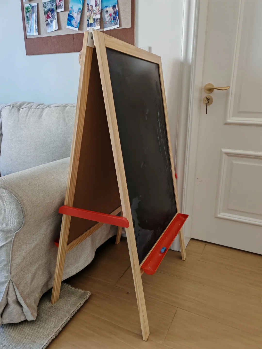 宜家的小黑板买了快一年,一直落灰,孩子偶尔用一下,说实话扔了真心疼,毕竟199大洋买的,但放着又碍事,在仅有二十平的客厅里还是很显眼的。 直接拆了上墙了,放在闲置的走廊里,还别说,没有一点违和感[doge]