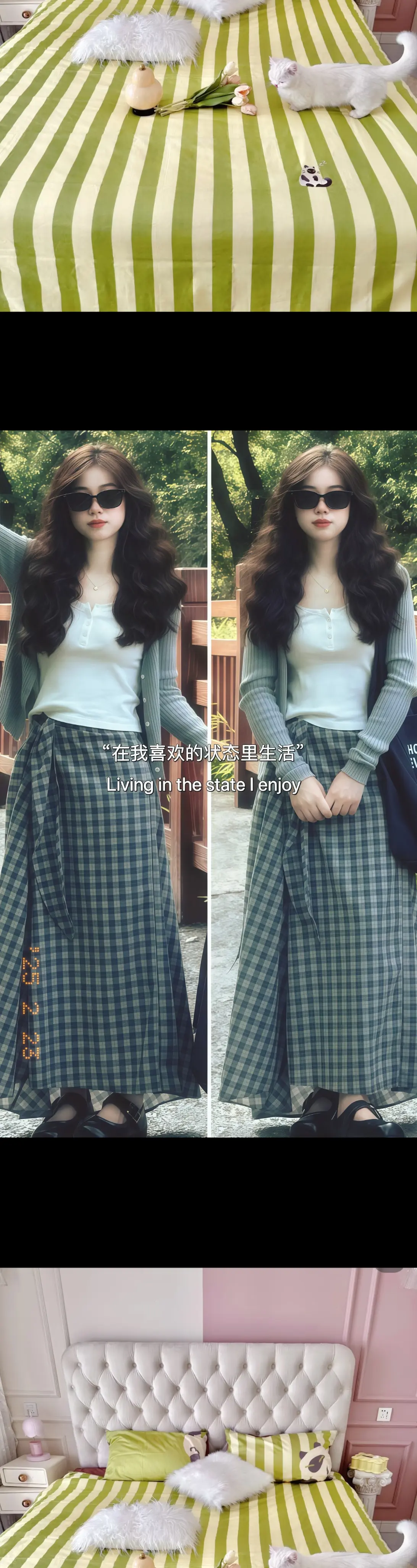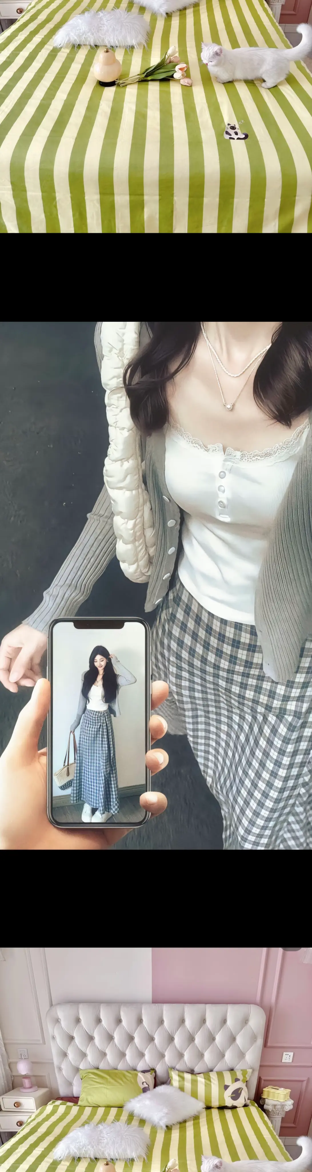 微胖女孩韩系纸片人穿搭好绝啊!白色蕾丝吊带+灰色针织开衫+蓝色格子长裙...